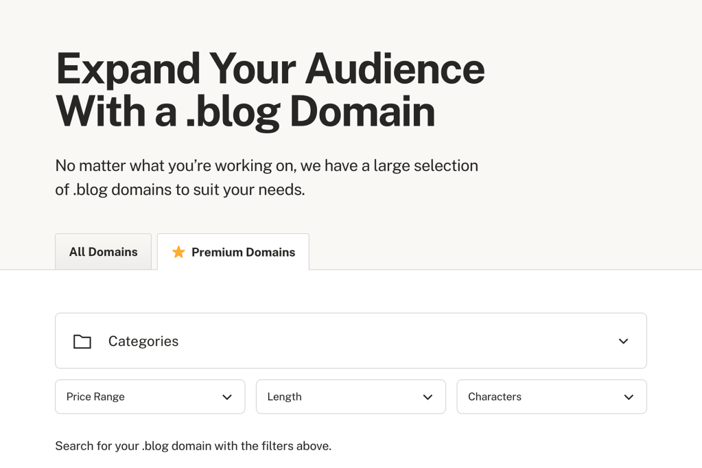 This switches the results to show only premium .blog inventory and unlocks additional filters designed to help narrow your search.